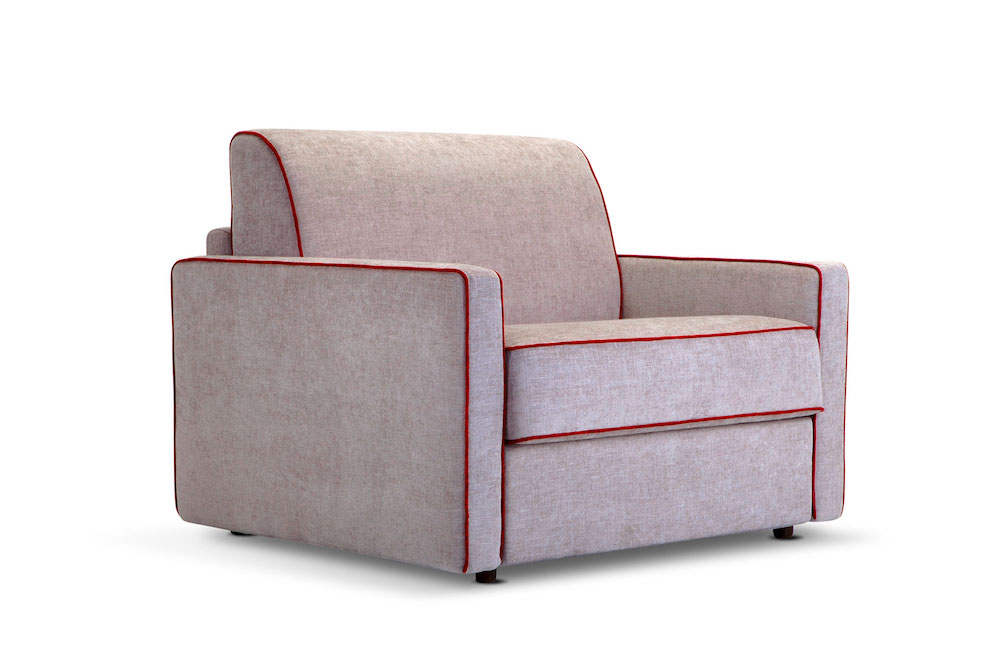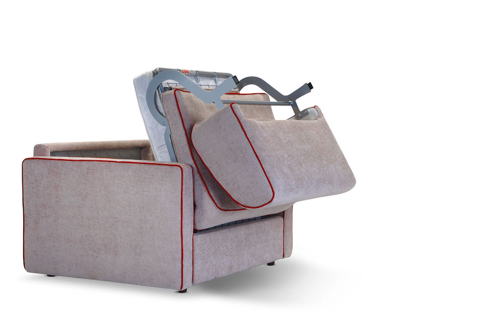 An armchair does not take space, can be squeezed into any room. The one in the picture below (Marie armchair in skinny armrest, by Domingo), presented with contrasting piping would be a welcomed addition to any home office. Pull the back of this armchair towards you and it will turn itself into a bed thanks to its revolving mechanism. No need to store the seat cushion. One quick pull and the bed is ready.