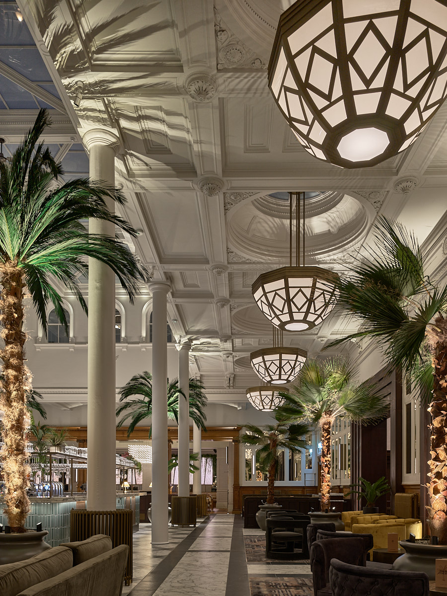 In the Palm Court, ten decagonal chandeliers suspend from the ceiling above creating pools of light below. Laser-cut antique fretwork contrasts against the matt opal ‘windows’ to create an atmospheric ambience that perfectly complements the purpose-built skylight above. Moving further through the hotel, a Deco-inspired brass and frosted glass chandelier brings real extravagance to its surroundings. Within the hand-finished frame sit 73 bespoke formed glass pieces, culminating in a floral likeness when viewed from beneath to create an immersive experience.