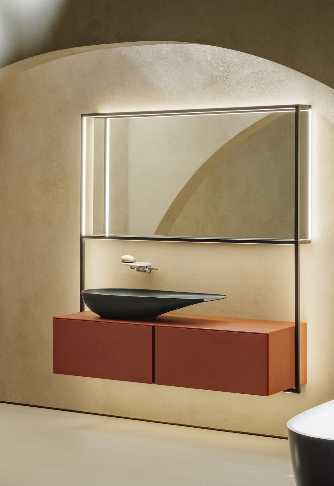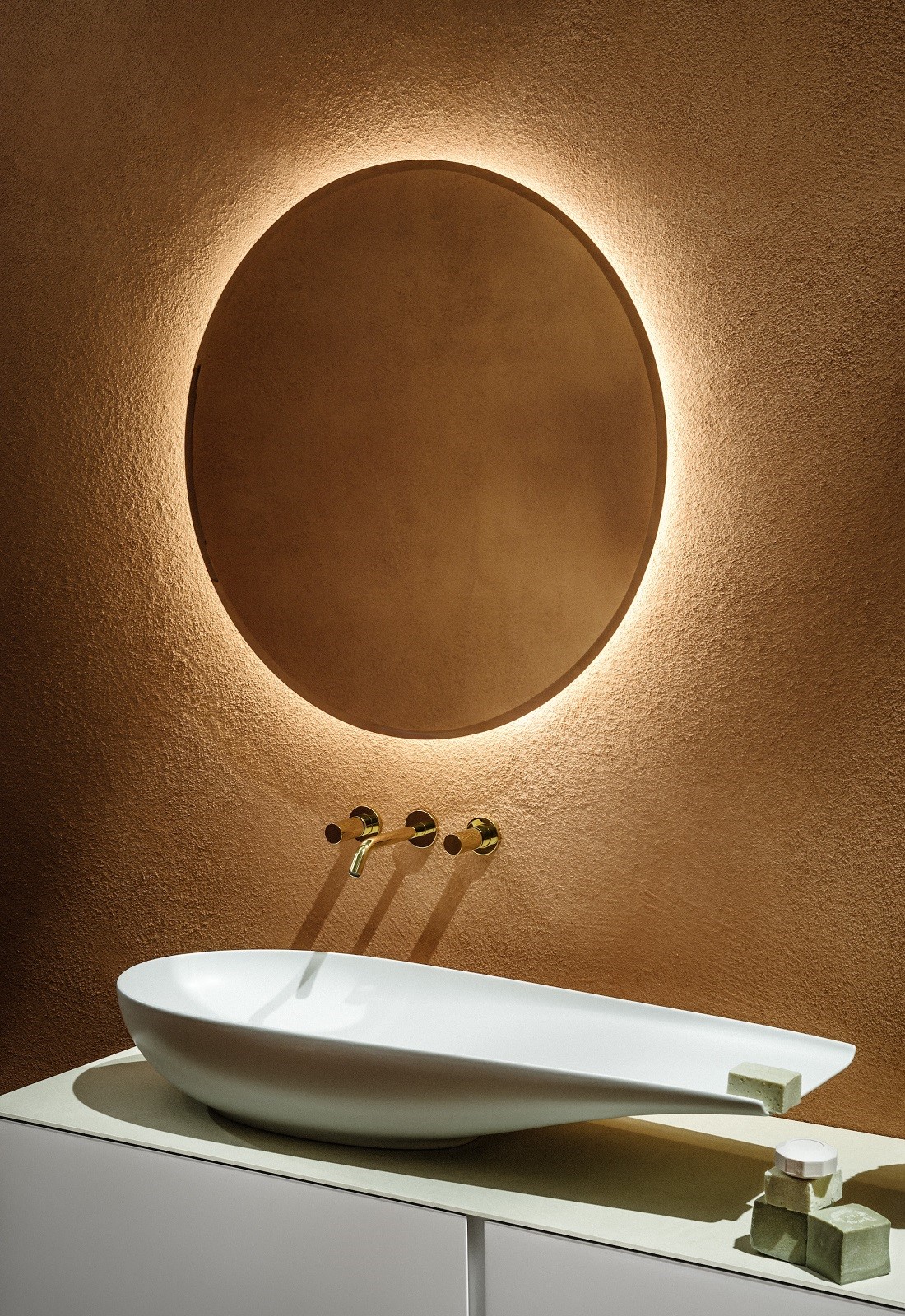 The LAUFEN ILBAGNOALESSI basins, WC and bath are available in choice of Matt White, Matt Black and Matt Coffee. Vanity units and tall cabinets come in wood effects and laminates in a choice of over 30 colours and three special finishes: Copper, Titanium and Gold.