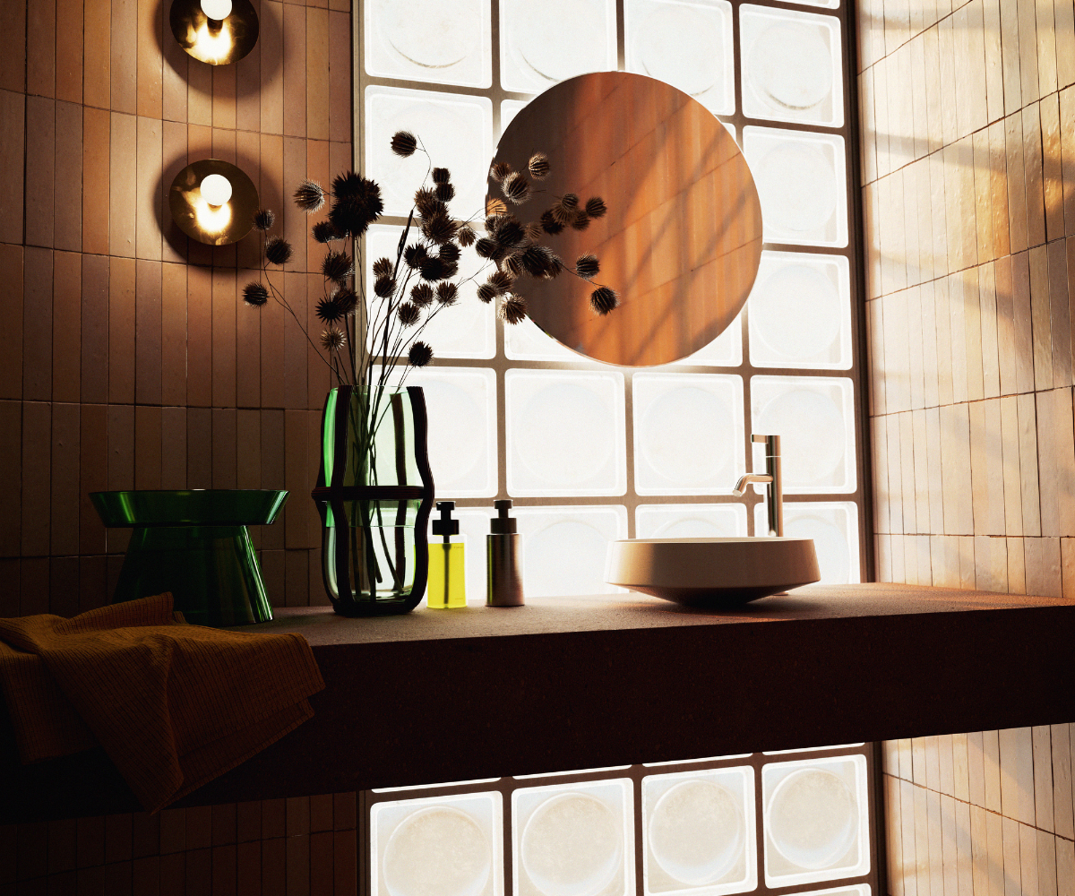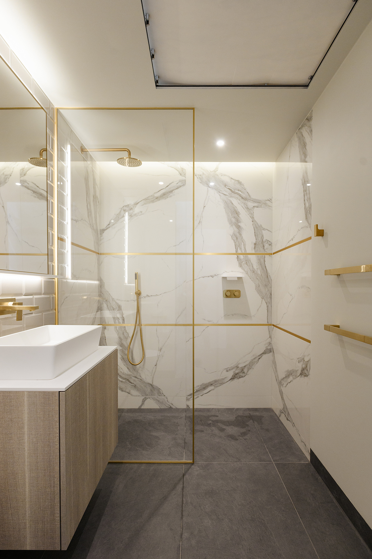The harmonious tone-on-tone palette incorporates natural plaster, sandblasted, and raked travertine, adding depth and texture. The sink, carved from a single block, features soft edges that mimic the bath’s curves and rounded edges. The travertine-adorned shower area exudes a simple yet luxuriously understated elegance, while the WC is discreetly concealed behind a timber wall, offering a glimpse of the inner courtyard through timber Venetian blinds.