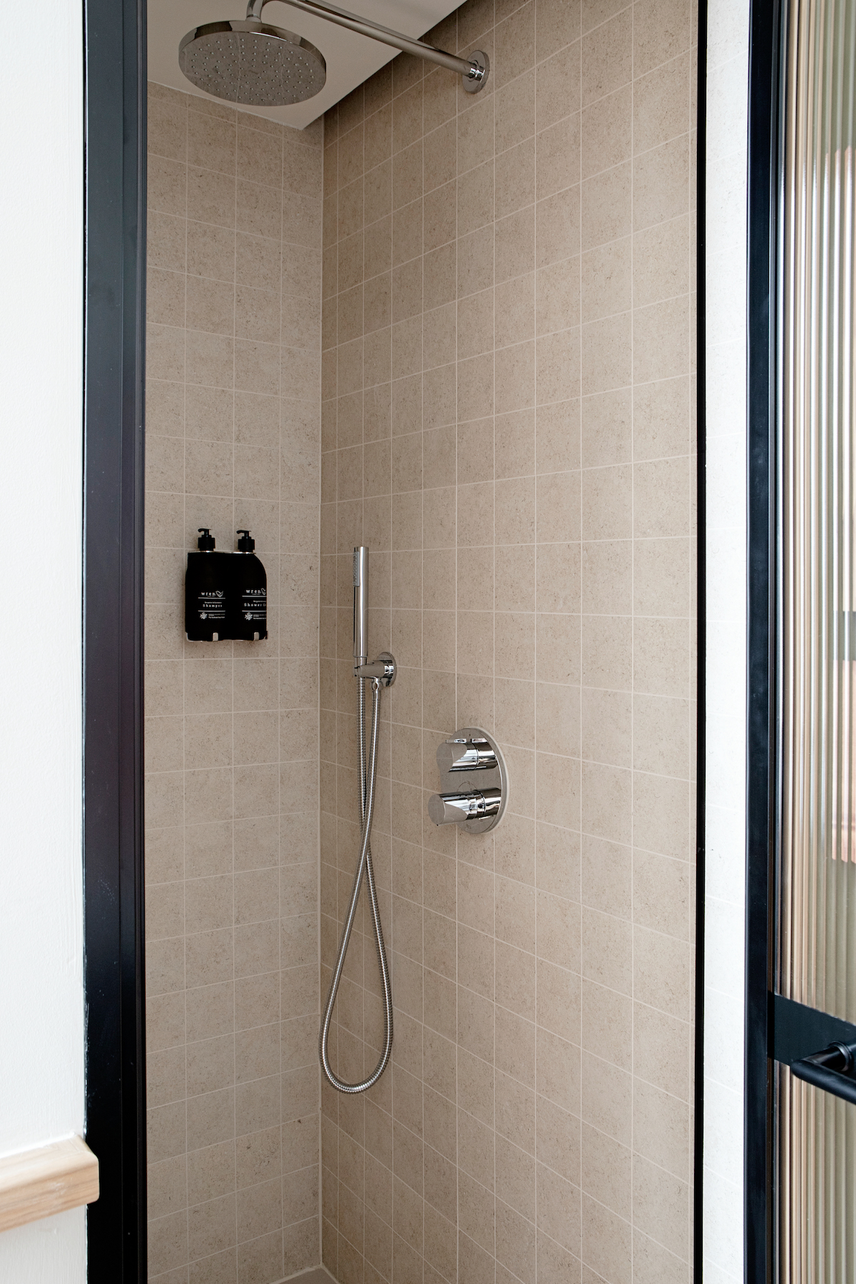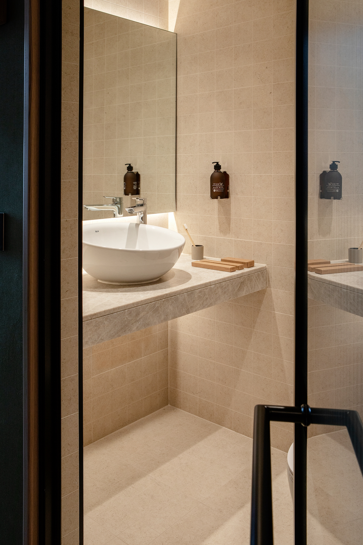 The bathroom intentionally only contains essentials – a washstand and a rain shower, supplemented by a spacious bath and seating. Light lime plaster is used extensively. Its matt finish is warm to the touch and behaves differently, depending on how the light strikes it, bringing out the vibrancy of the material. Grooving on the floors and the washstand enhances the sensory experience, creating additional visual appeal. This is combined with wood and glass, as well as terracotta coloured textile notes.